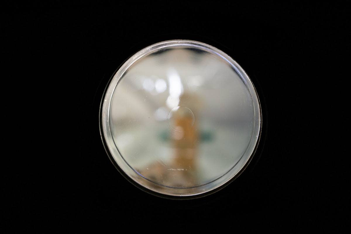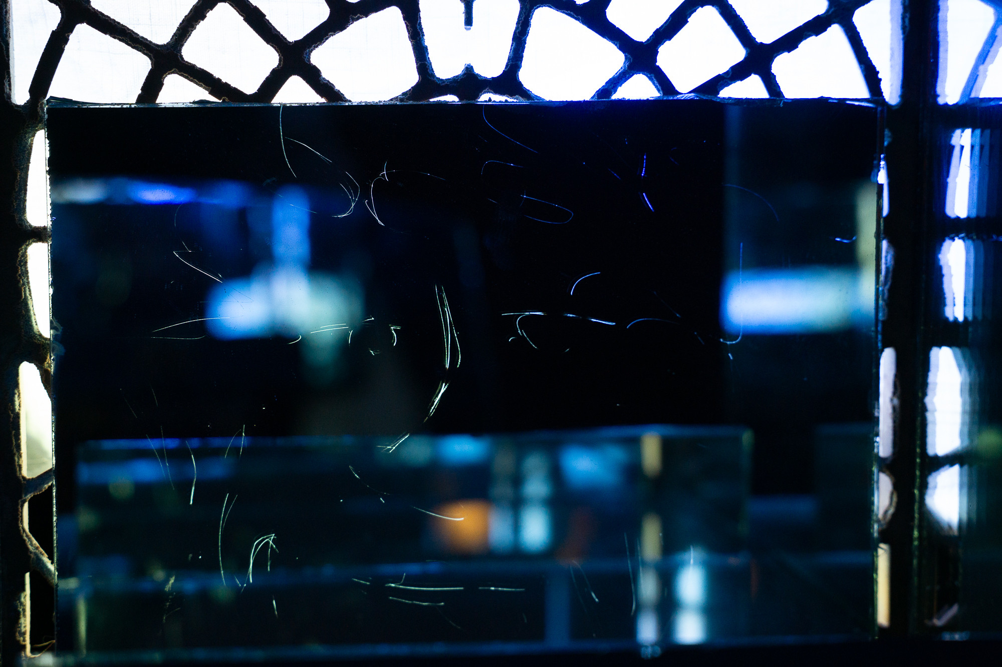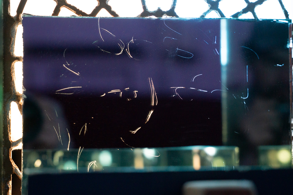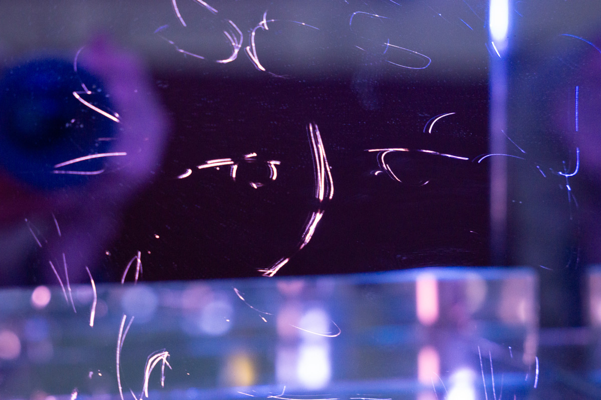 force majeure (a reflection of you within a reflection of me), 2026. scratched mirror, mood lighting. 12" × 12 " 12 "
